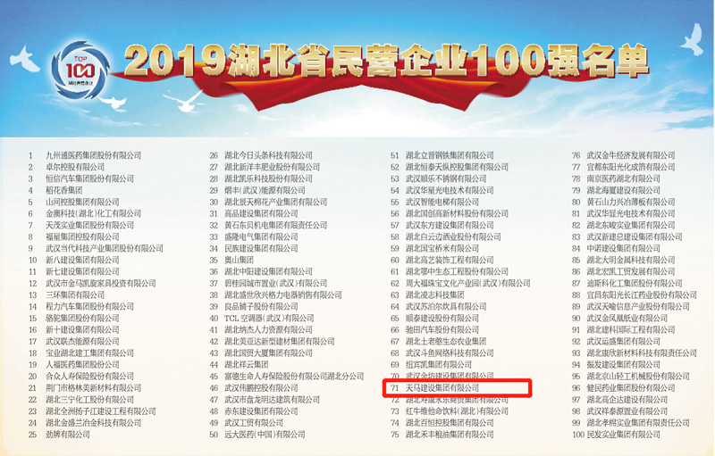 7月30日,省工商聯發布了2019湖北省民營企業百強名單。榜單以2018年企業營業收入排序,我司蟬聯“2019湖北民營企業100強”第71名,較去年上升4位!
