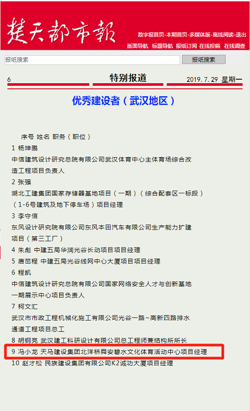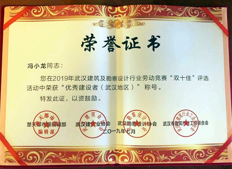 近日,由楚天都市報、武漢建筑業(yè)協(xié)會、武漢勘察設計協(xié)會、武漢市建筑行業(yè)工會聯(lián)合會聯(lián)合主辦,被譽為武漢城建行業(yè)“奧斯卡”的2019年武漢建筑及勘察設計行業(yè)勞動競賽“雙十佳”評選頒獎典禮,在楚天傳媒大廈隆重舉行。天馬建設集團北洋橋舜安碧水文化體育活動中心項目經理馮小龍榮獲武漢建筑及勘察設計行業(yè)“優(yōu)秀建設者(武漢地區(qū))”榮譽稱號。